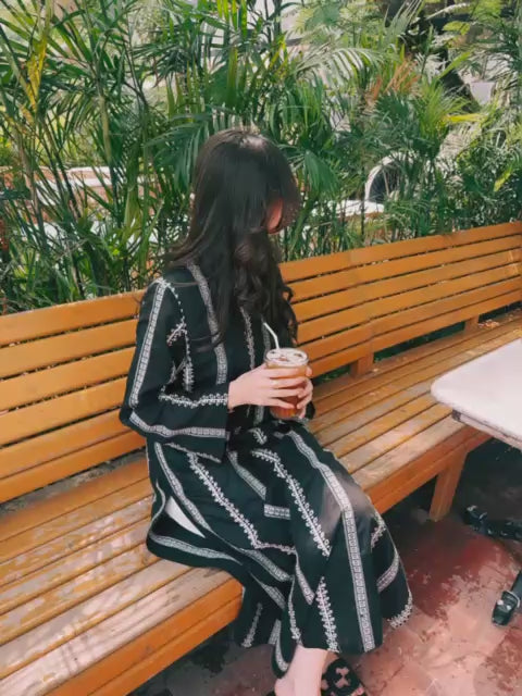 A sleek black kurta, the epitome of understated elegance. Adorning this classic piece is intricate white geometric embroidery, a modern twist on a timeless design. The stark contrast between the black fabric and the crisp white thread creates a visually stunning effect. This kurta is a versatile staple, perfect for both casual outings and more formal events, offering a sophisticated look with a touch of artistic flair.