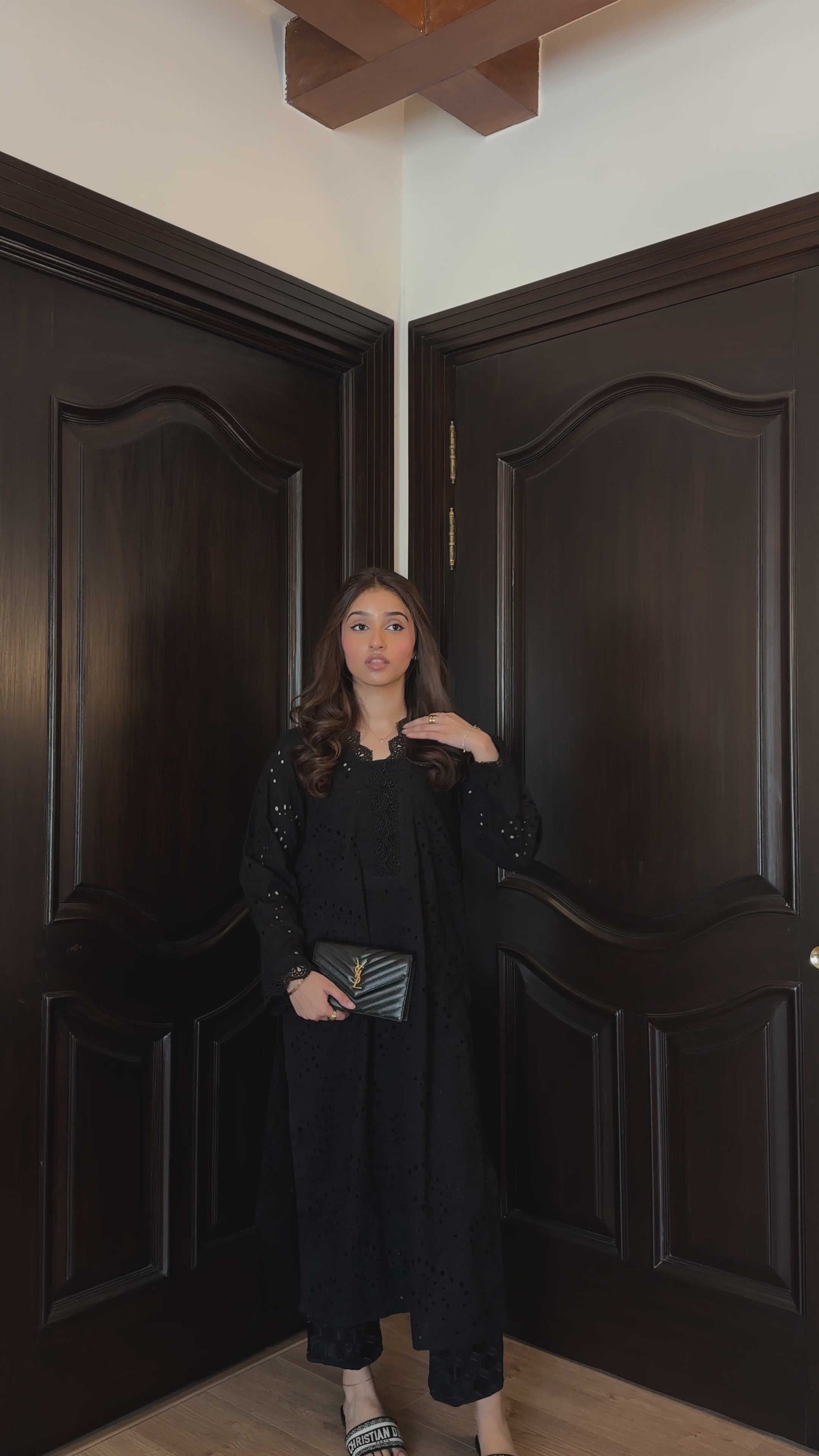 Crafted from the finest fabric, this black kurta features a classic V neckline with lace embellishments, straight-cut full sleeves. Embrace the timeless allure of this gorgeous black outfit that is a true staple for your summer wardrobe.
